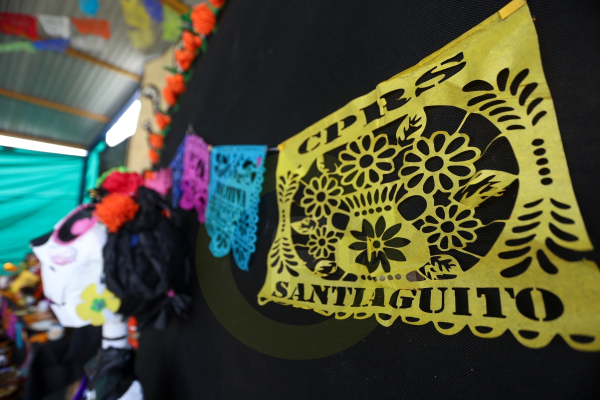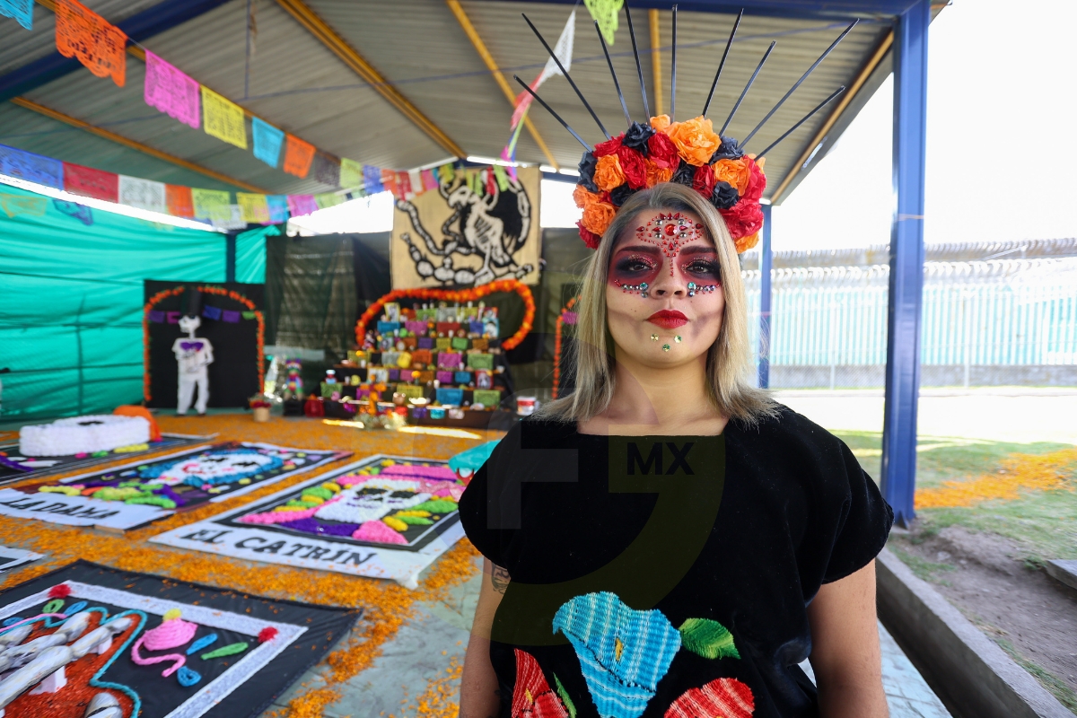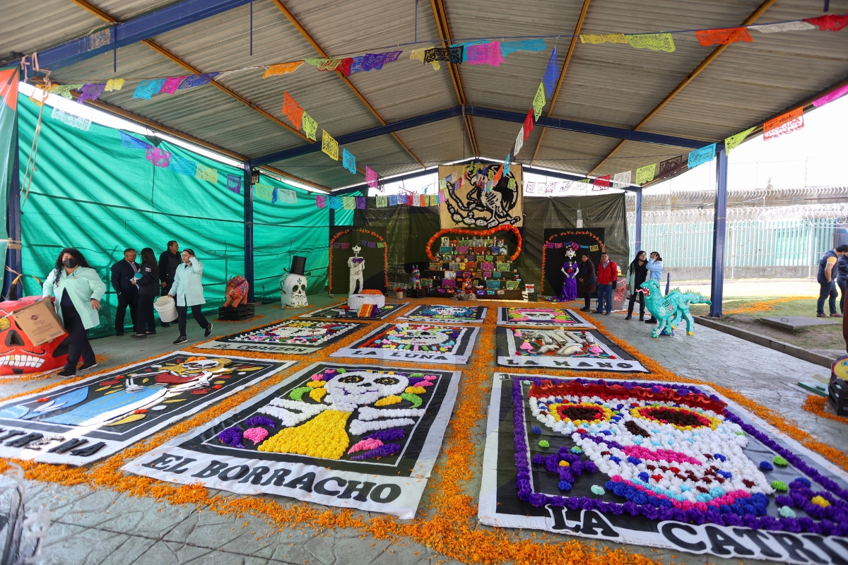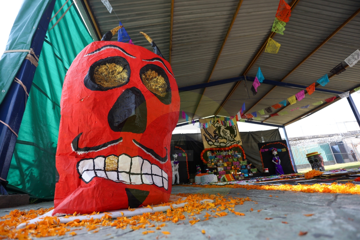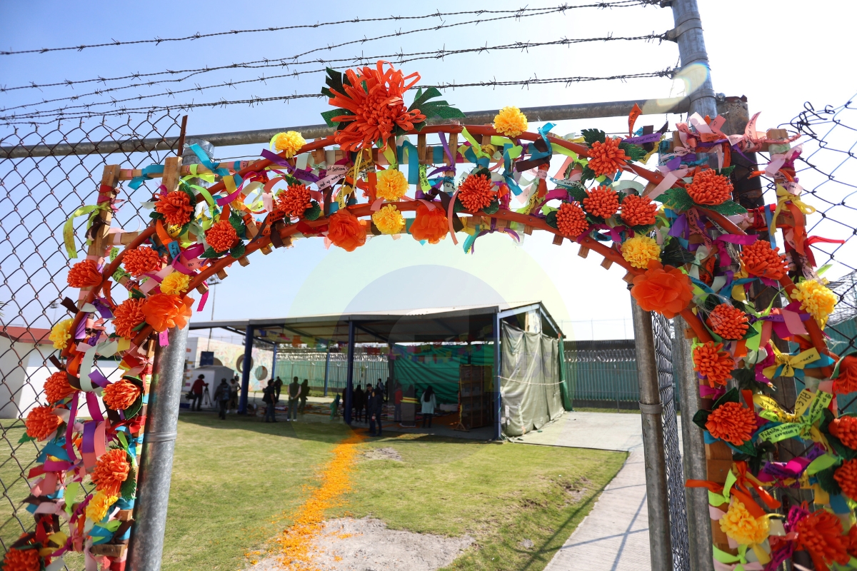 En uno de los patios del penal, la ofrenda rompe la estampa fría de Santiaguito, sus colores vivos contrastan con los uniformes de los PPLs, de los custodios.